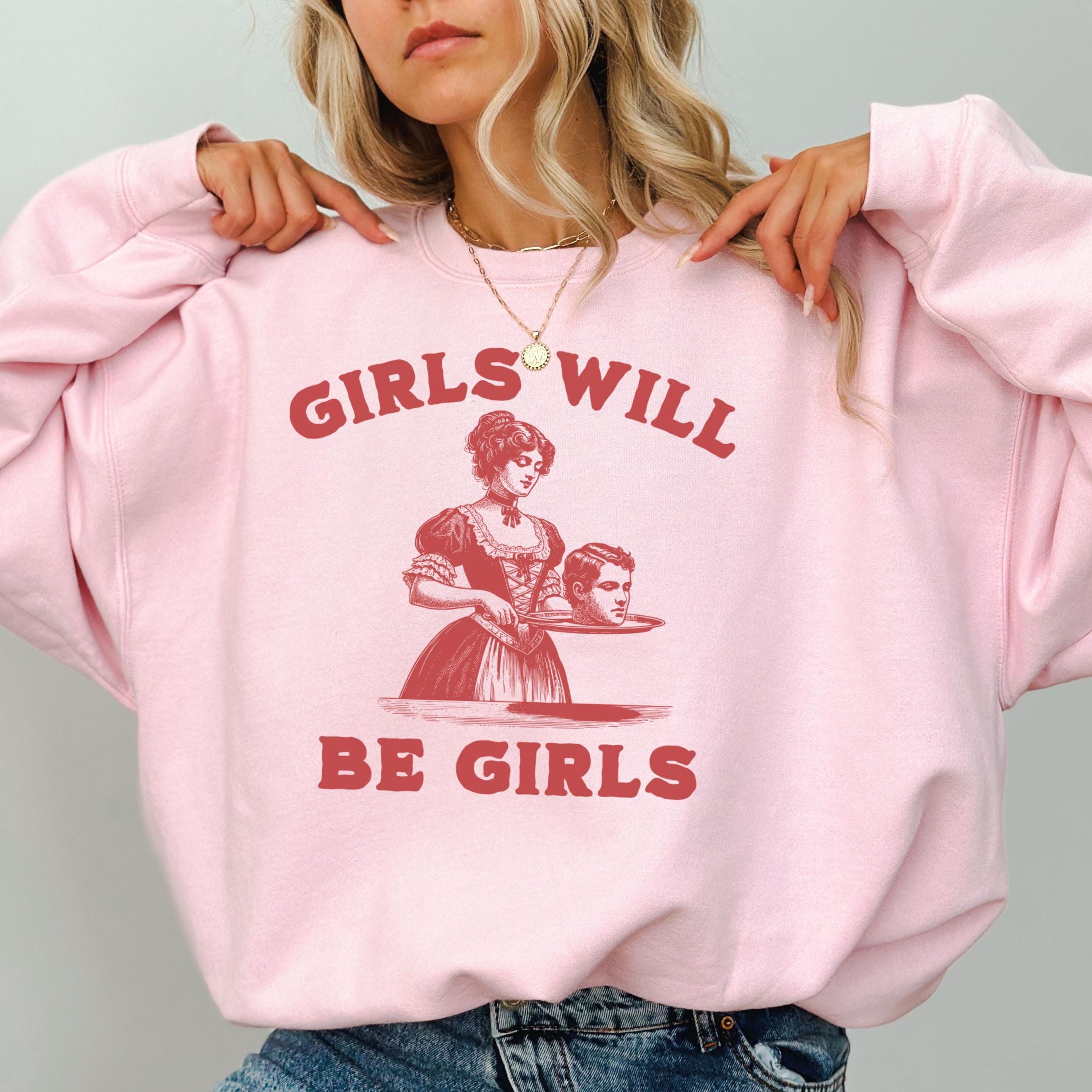 Girls Will Be Girls Sweatshirt with a bold and funny Y2K style graphic, perfect for feminists smashing patriarchy and embracing activism. This unhinged feminist sweatshirt combines a vintage aesthetic with a powerful message, making it an ideal gift for girls, activists, or anyone who values women’s rights. For a baggy oversized fit, size up!